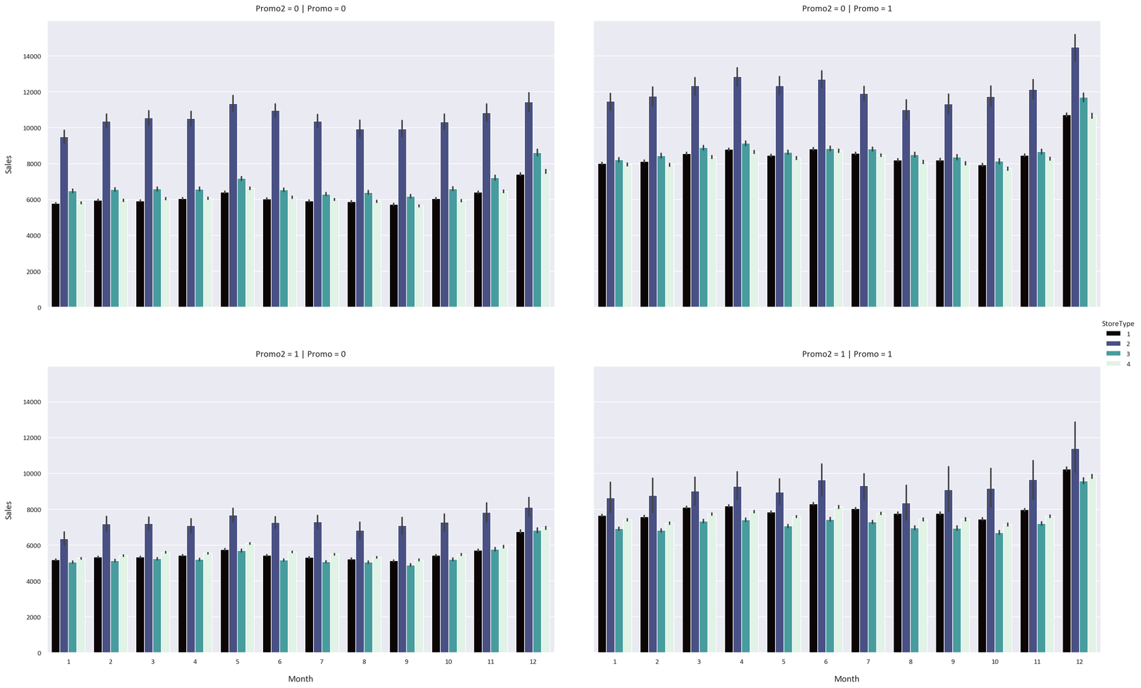 Both models perform extremely well, with the XGBoost regressor performing slightly better. This is because the XGBoost regressor is an iterative model, so it can learn from its mistakes and improve its predictions. It learnt that the Promo and Promo2 features are very important, while the random forest regressor didn’t learn this.